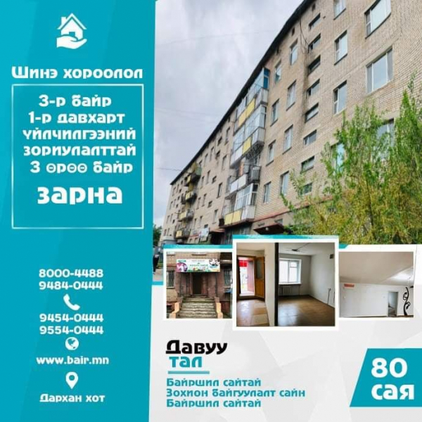 Шинэ хорооллын 3-р байранд үйлчилгээний зориулалттай 3 өрөө байр худалдана.