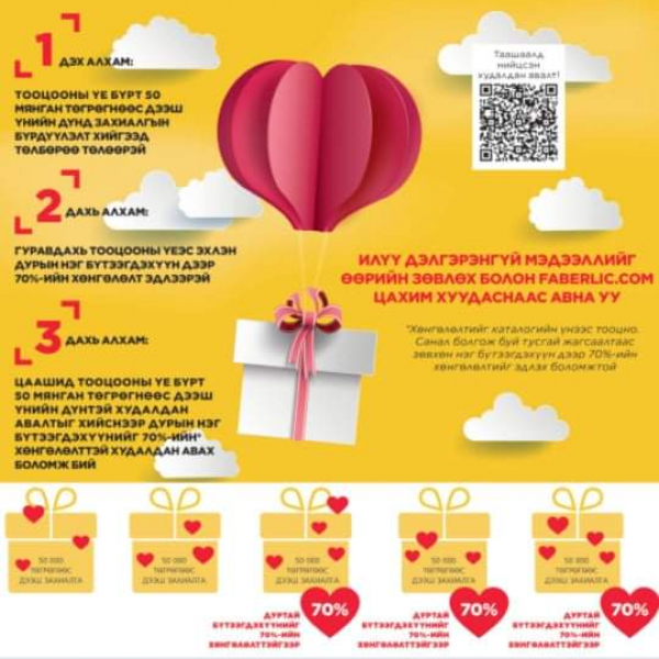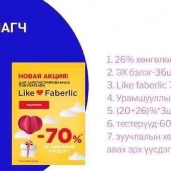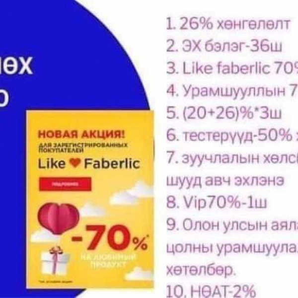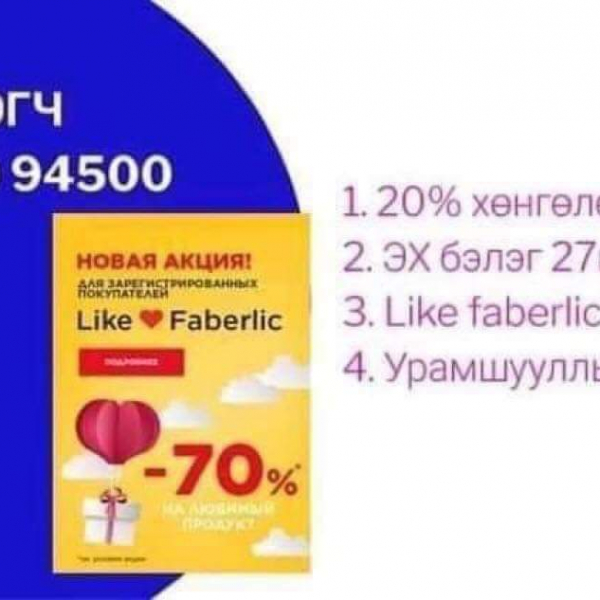 Faberlic brendiin goo saihnii zahialga bolon vngvi id kod vvsgeed 20%hyamdraltai hudaldan awalt tsaashilaad hyamdral uramshuulald hamruulna: -99549226