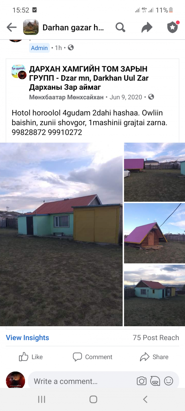 Дархан сум Хөтөл хороолол 3р гудам 2дахь хашаа. Өвлийн 5×6 байшин 3×6 граш 2,5×3 зуны шовгортой 07га газартай.